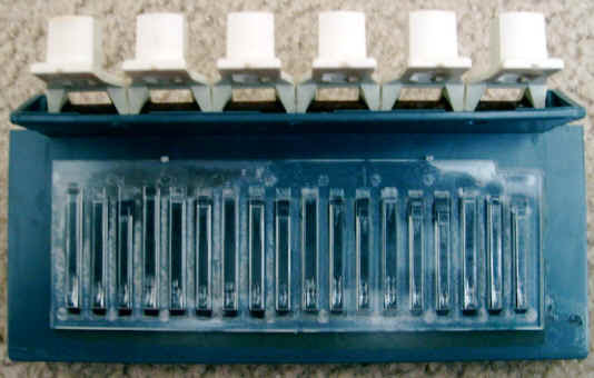 You notice the three left keys are mashed, uncovering that particular channels vent.  The two keys on the right are not pressed, and the foam under the key seals off the vent so that no air may escape from that channel, keeping those note from playing.  These are considered free reed aerophones, like an accordion, and they sound similar.